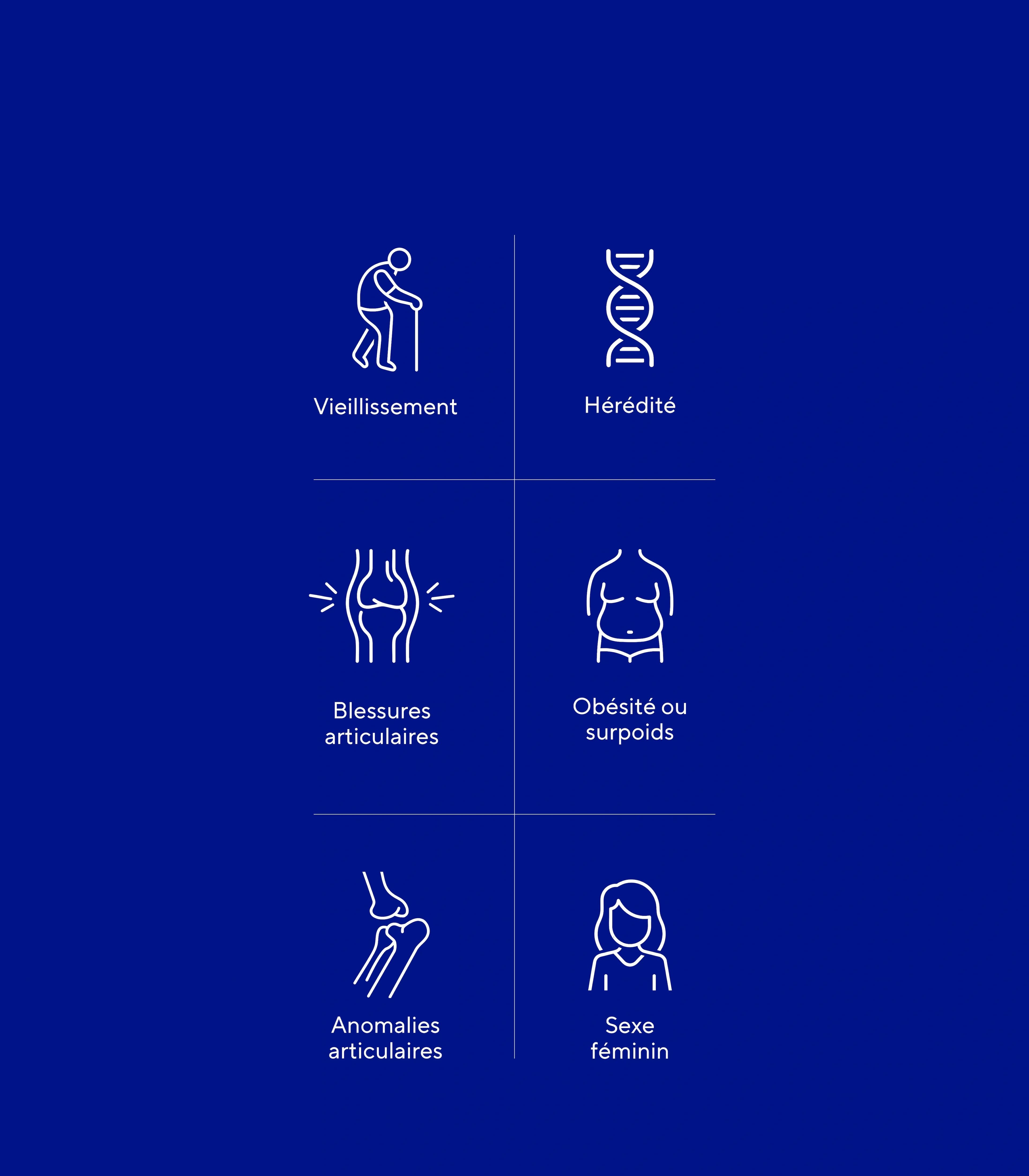 Il existe de nombreux facteurs de risques favorisant l'apparition de l'arthrose, parmi eux on retrouve :