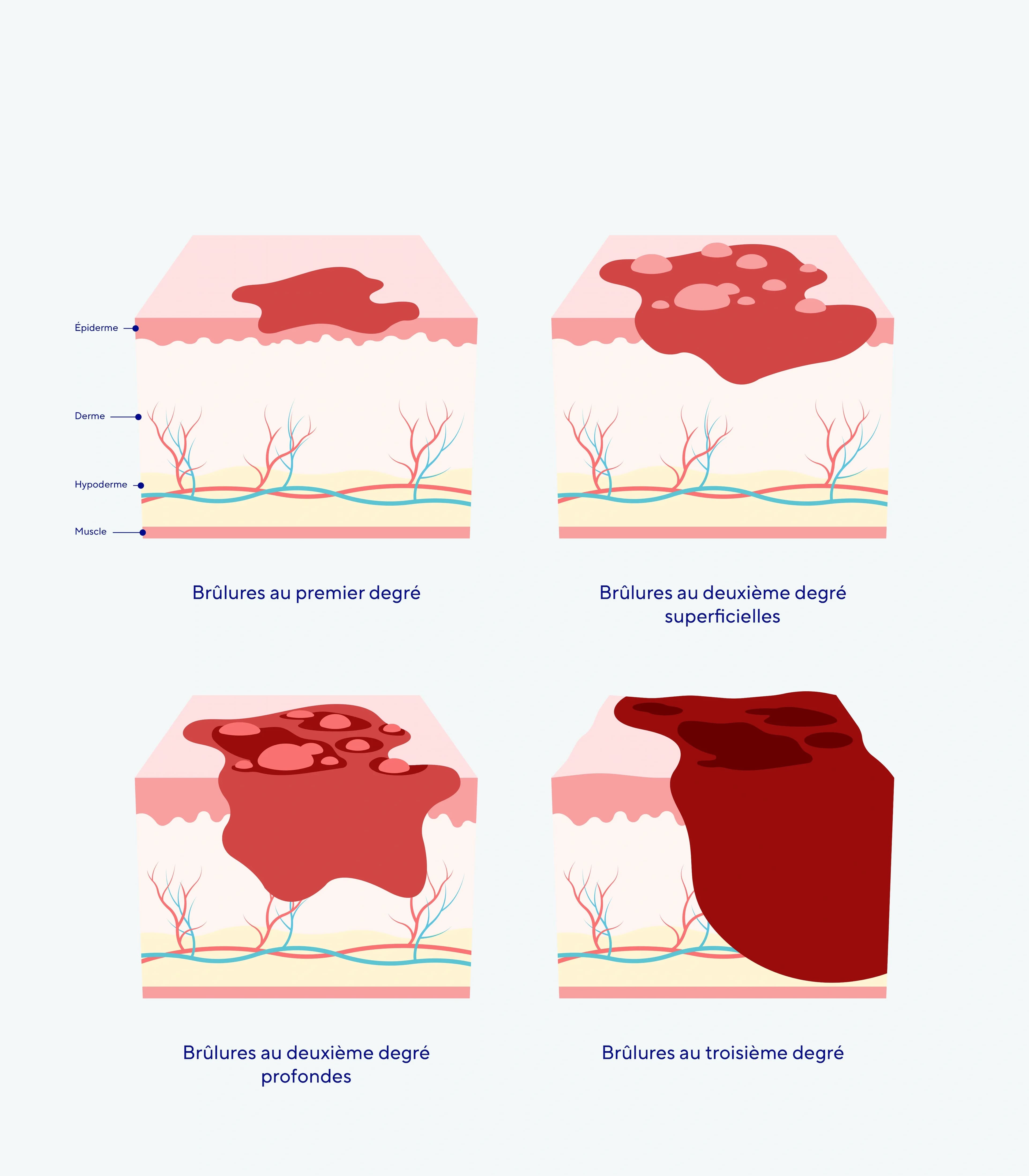 Les brûlures superficielles (premier degré et deuxième degré superficiel) peuvent cicatriser spontanément sans séquelles, alors que les brûlures profondes (deuxième degré profond et troisième degré) nécessitent un geste chirurgical (excision-greffe) et peuvent s’accompagner de séquelles fonctionnelles. Elles vont donc être considérées plus graves(2).