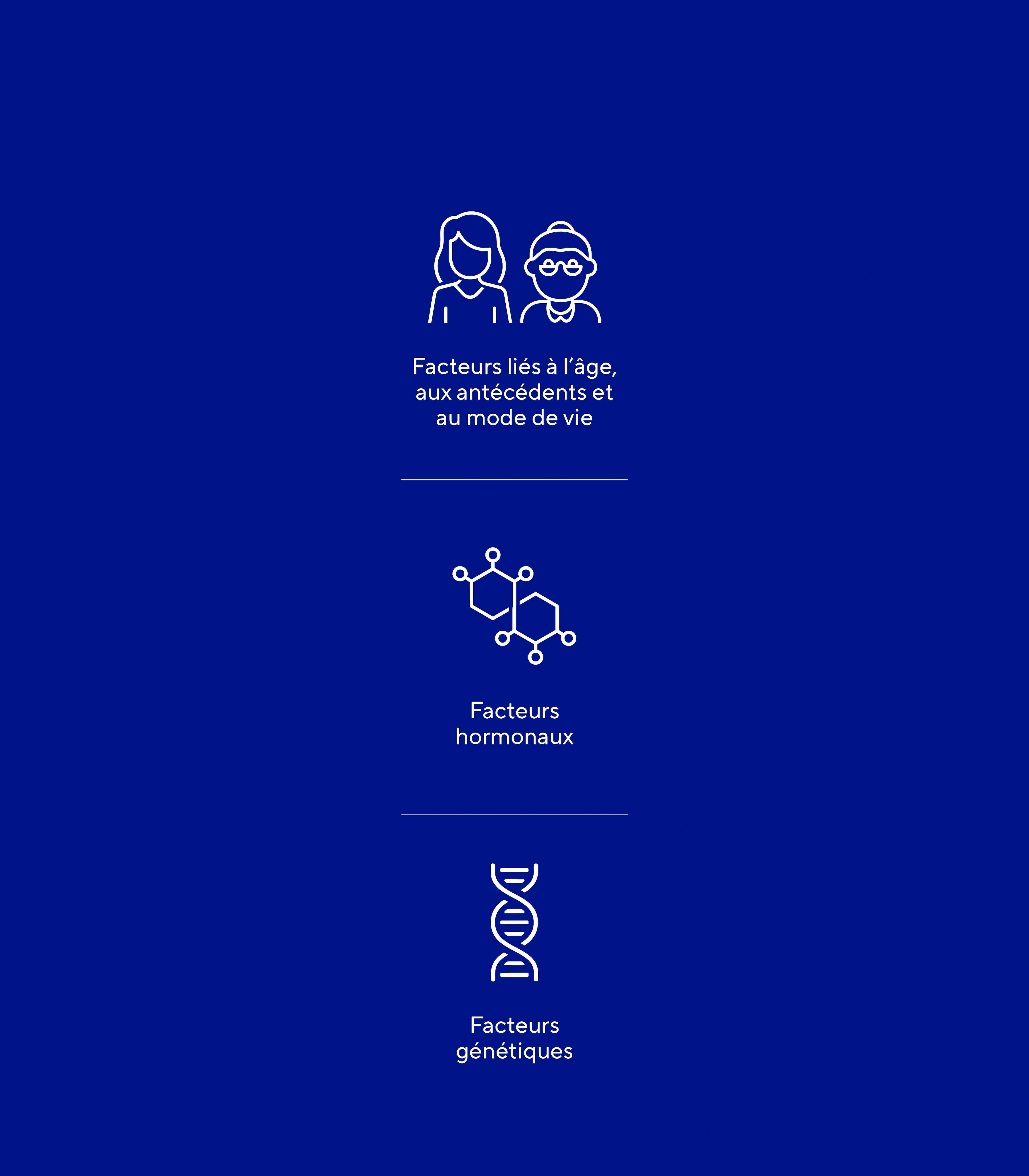 Parmi les facteurs de risque du cancer du sein on retrouve notamment l’âge car la moitié des cancers du sein survient entre 45 et 65 ans(3). Des comportements modifiables comme l'inactivité physique, une consommation excessive d'alcool, le tabagisme et le surpoids augmentent le risque de cancer du sein(4).