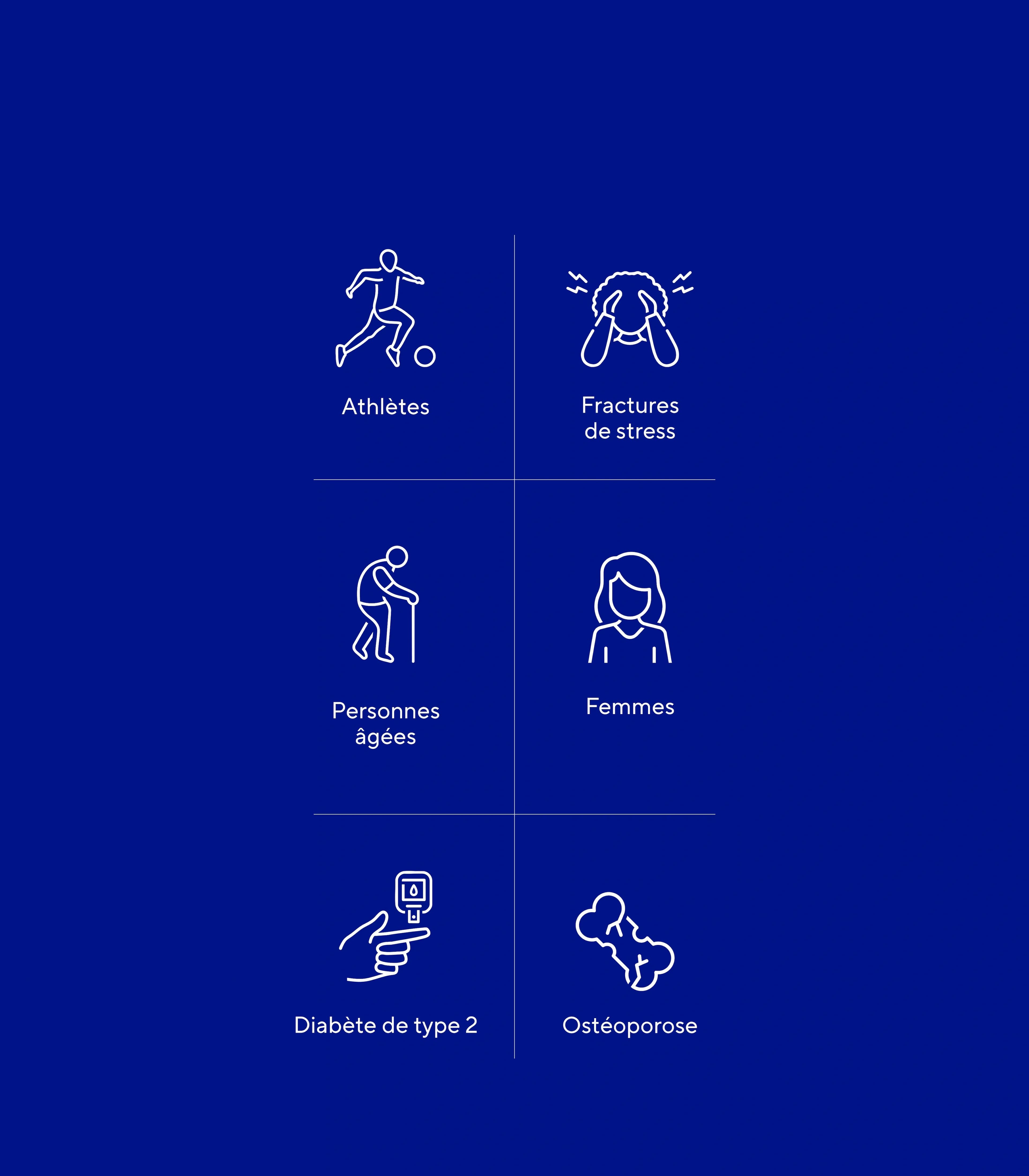 La diminution de la densité osseuse liée à l'âge, particulièrement prononcée après 50 ans, rend les personnes plus vulnérables aux fractures(14).