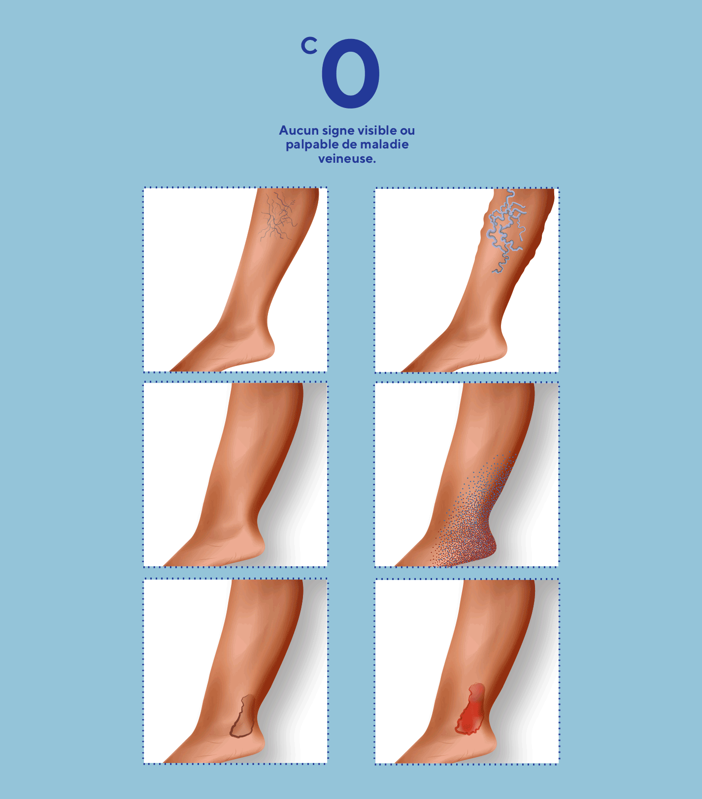 - C4 : Modifications cutanées dues à la maladie veineuse, avec C4a indiquant une pigmentation ou un eczéma, et C4b se référant à la lipodermatosclérose ou à l’atrophie blanche.