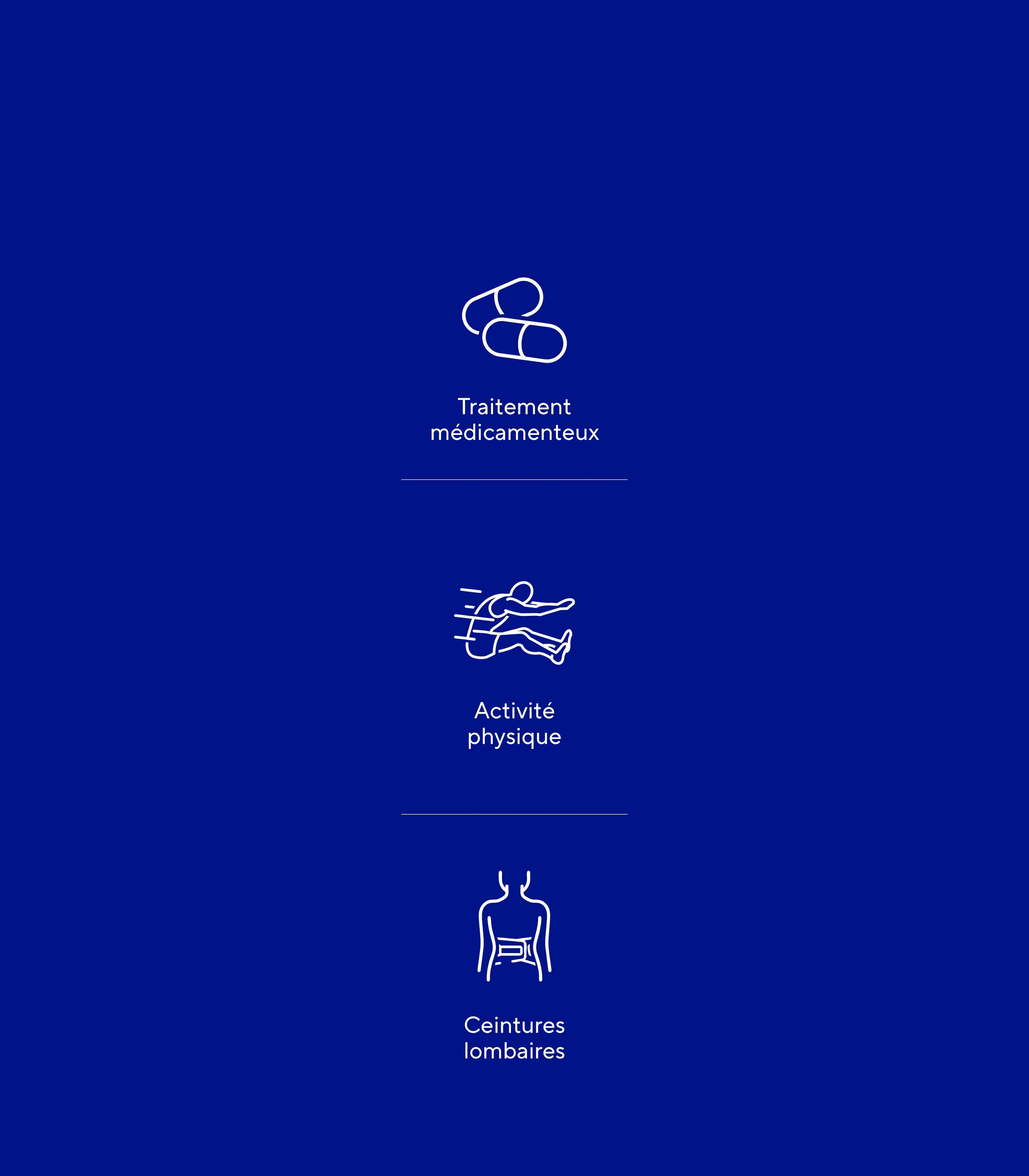 La poursuite de vos activités, dans les limites de la douleur, est essentielle. Cela favorise le passage à la chronicité. Il faut bouger, développer sa masse musculaire et adopter une bonne hygiène de vie.
